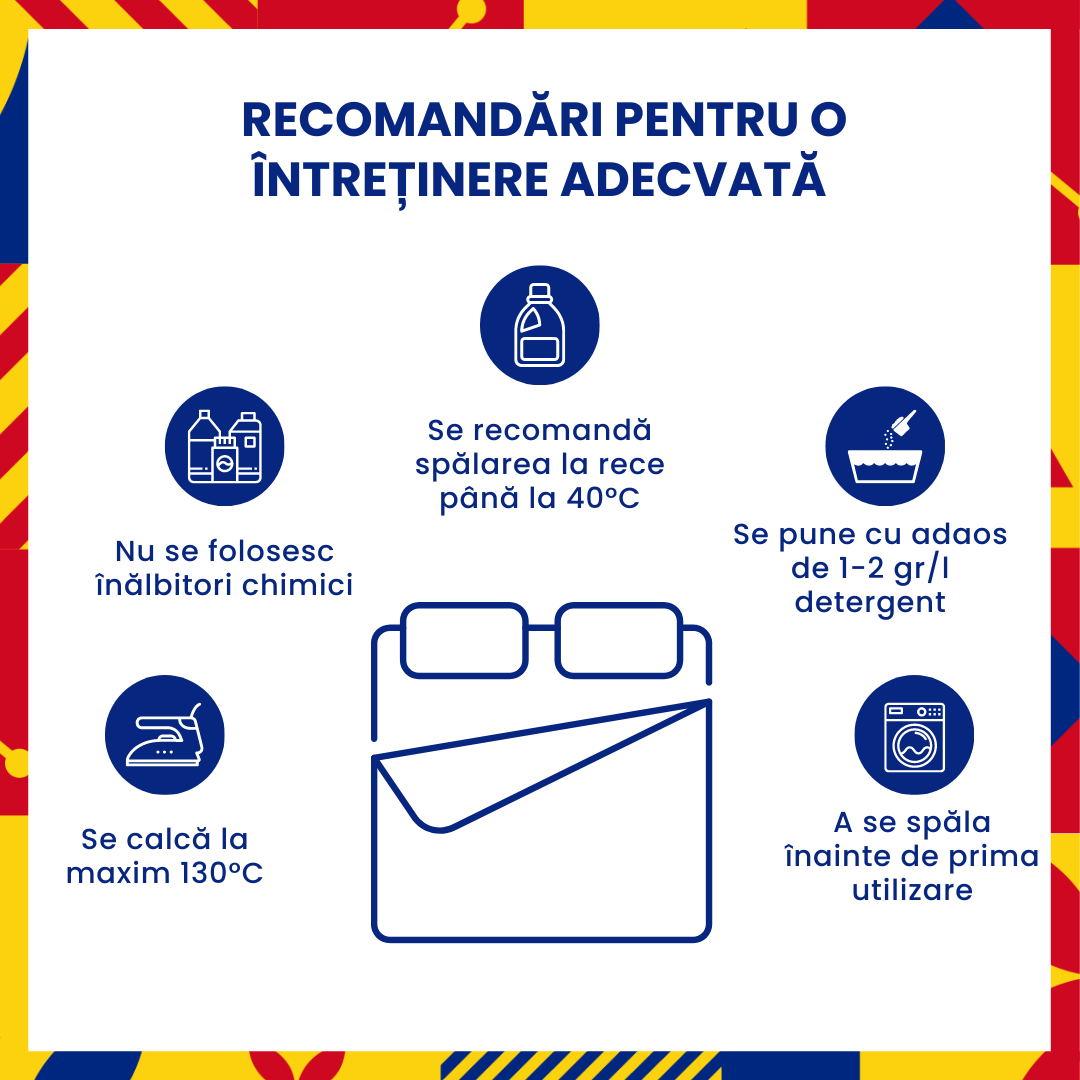 Materialul este de o foarte buna calitate fiind tratat antisifonare, iar astfel nu necesita calcare. Tesatura fiind moale si usoara, lasa pielea sa respire in timpul somnului. Lenjeria este foarte usor de intretinut, nu intra la apa, iar culorile se pastreaza in timp.