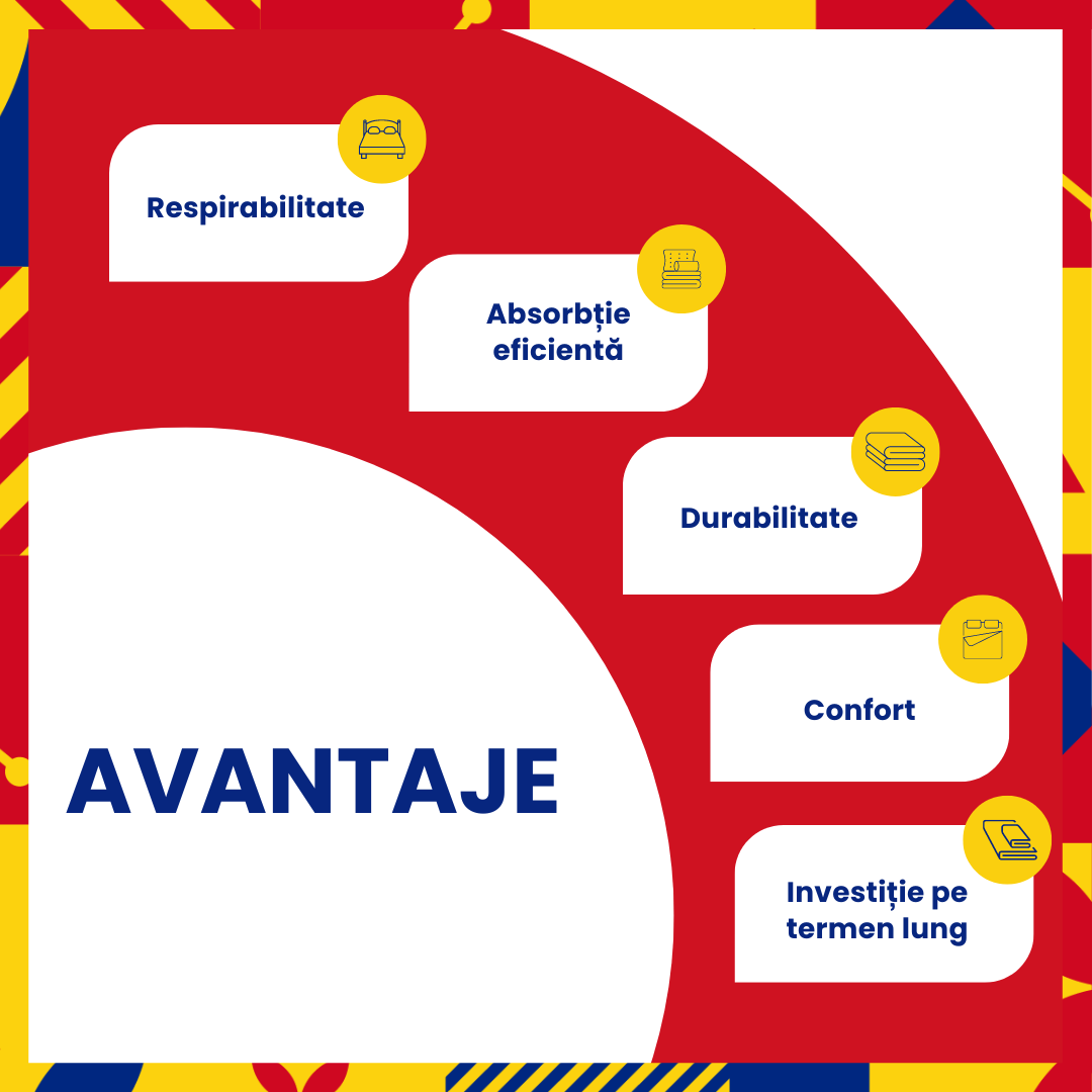 Materialul este de o foarte buna calitate fiind tratat antisifonare, iar astfel nu necesita calcare. Tesatura fiind moale si usoara, lasa pielea sa respire in timpul somnului. Lenjeria este foarte usor de intretinut, nu intra la apa, iar culorile se pastreaza in timp.