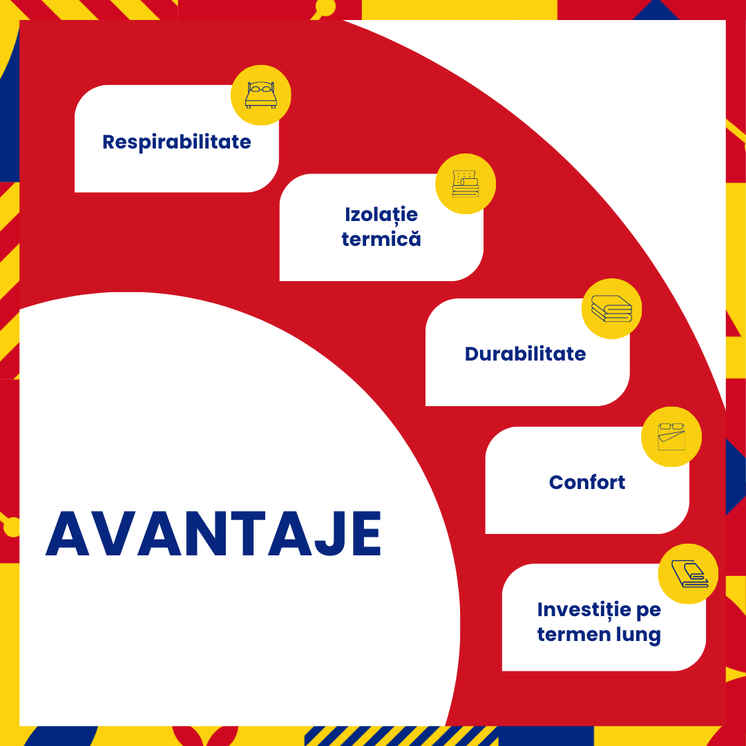 - Umplutura din lana 100% naturala: Umplutura din lana naturala este cunoscuta pentru capacitatea sa excelenta de a retine caldura si de a va mentine confortabil si calduros in timpul iernii. Lana este un material respirabil si termoregulator, astfel incat veti simti mereu un climat optim in timpul somnului.